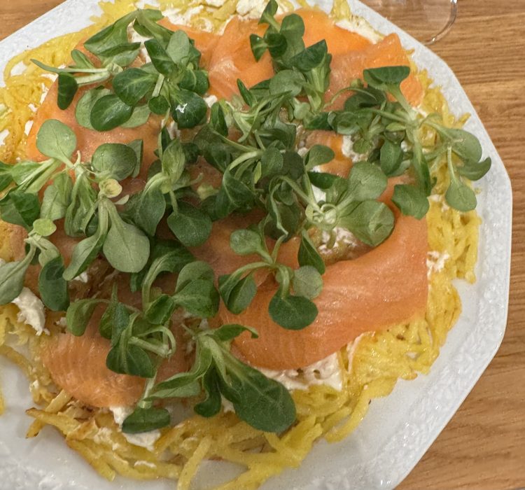Это скорее вкусная и сытная закуска или очень сытный завтрак. Немцы называют такую жареную картошку – Рёсти, но если добавить соленый лосось и зелень, то получается почти гастрономическое блюдо. Пропорции тут очень примерные, все зависит от вкуса и наличия продуктов в холодильнике. Итак нам понадобиться: